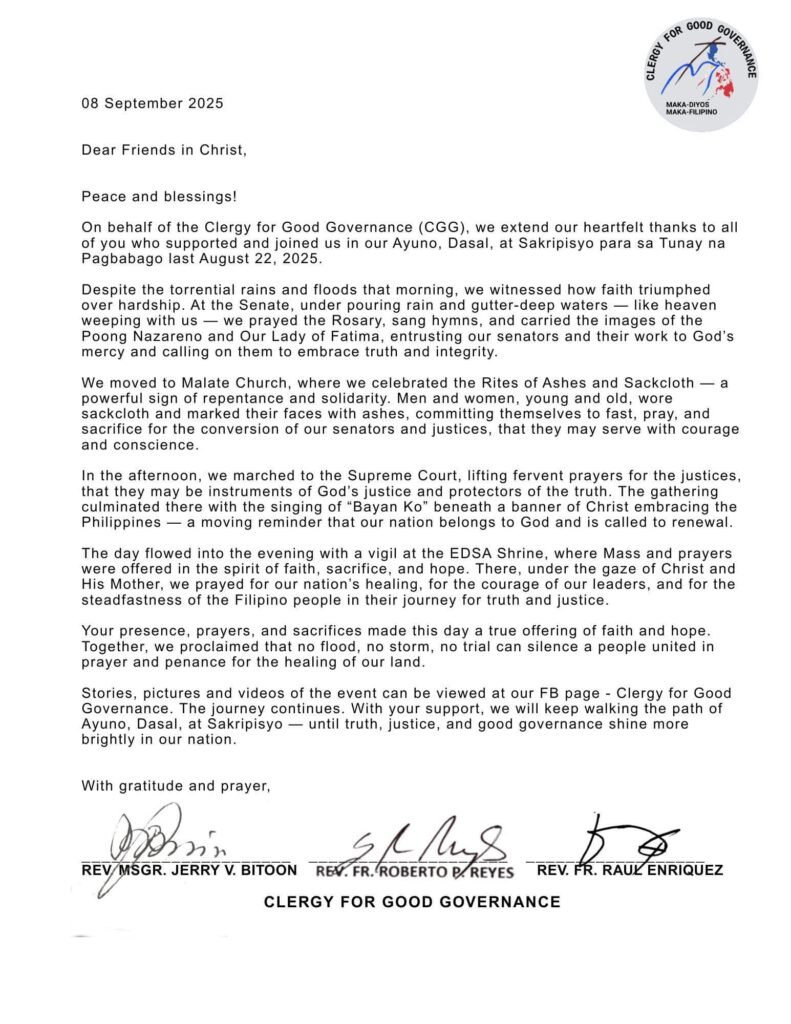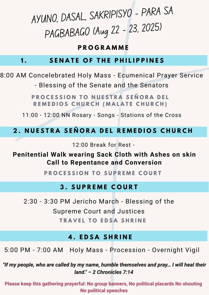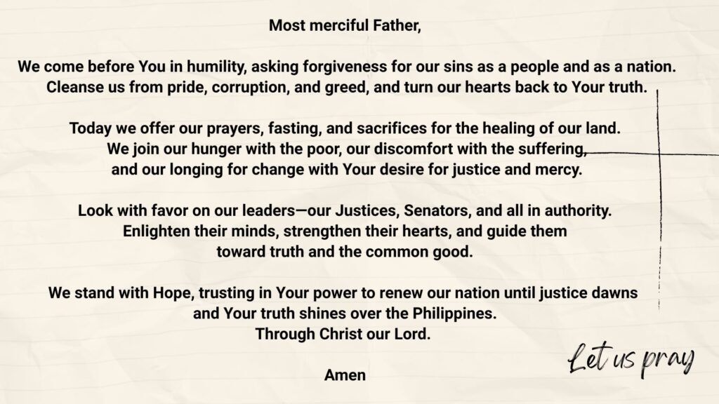 Carrying the Poong Nazareno and Our Lady of Fatima, the faithful moved to Malate Church, where the Rites of Ashes covered faces with dust and people wore sackcloth as a sign of repentance and sacrifice. They pledged to fast, to pray, and to offer every discomfort for the conversion of Senators, Justices, and all who hold power over our land.