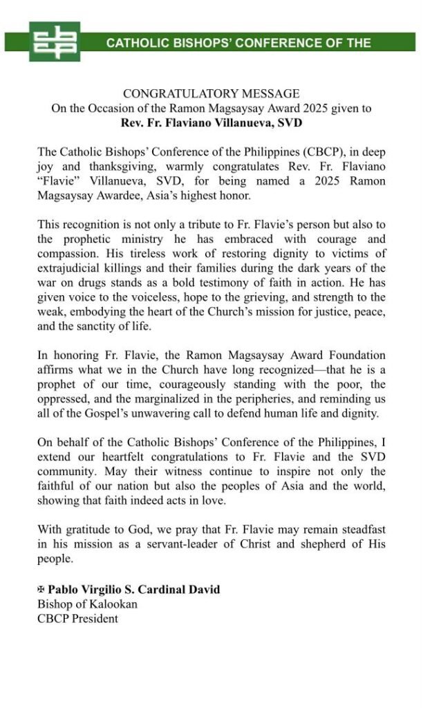 Father Flaviano Antonio Villanueva, a 2025 Ramon Magsaysay Awardee, is a priest dedicated to serving marginalized communities, especially the families of extrajudicial killing (EJK) victims during the Philippine drug war. His work transforms grief and injustice into healing through two main programs: the Arnold Johnson Kalinga Center, which aids the homeless, and “Pagilum,” which supports widows, orphans, and families affected by the drug war. Father Flavy’s personal history as a former drug addict turned priest fuels his empathy and advocacy. He emphasizes healing as a holistic process involving trauma recovery, legal aid, education, and livelihood. Despite threats and political controversies surrounding his work, Father Flavy remains committed to justice, peace, and the sanctity of life, advocating for non-violent solutions to drug addiction and systemic reforms. He calls for accountability from political leaders and remains hopeful for societal change, grounded in faith and human dignity.