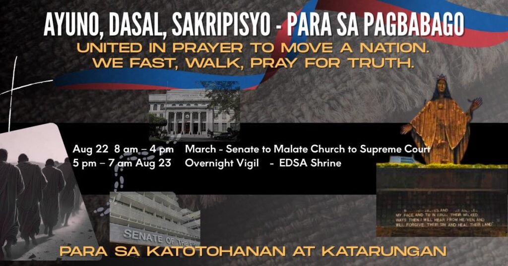 We Fast, Walk, Pray for Truth. AYUNO, DASAL, SAKRIPISYO – PARA SA TUNAY NA PAGBABAGO We pray not only for ourselves, but for our Senators and our Justices—that God may pierce their hearts with courage, wisdom, and integrity to stand for truth and justice. The enemy may try to hinder our mission, but by God’s […]